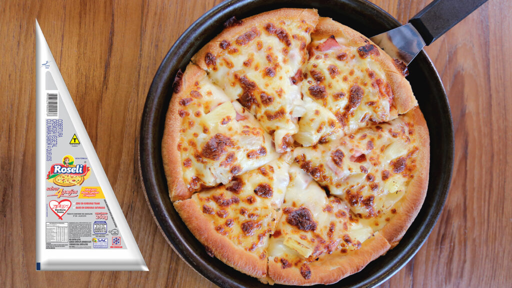 • Adicione a Cobertura cremosa sabor 4 queijos Roseli, seguido da muçarela, tomate, manjericão e orégano.